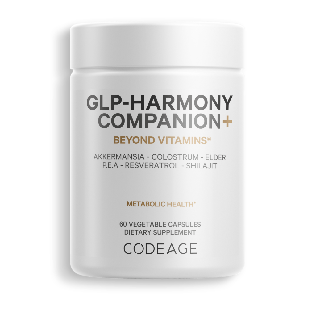 Codeage GLP-Harmony Companion+ supplement combines Lion’s Mane, PEA, colostrum, shilajit, elder fruit, akkermansia, resveratrol, and other ingredients to offer a modern supplement to the wellness regimen of GLP-1 agonist users.*