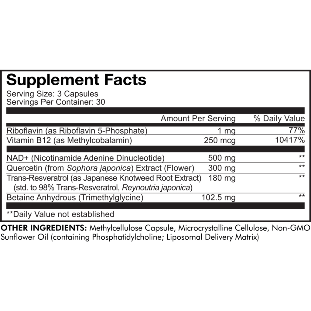 - This ultra formula includes NAD+ and additional ingredients like quercetin from Sophora japonica flower, resveratrol from Japanese Knotweed extract, betaine anhydrous, riboflavin as Riboflavin 5-Phosphate, and vitamin B12 for a well-rounded supplement.