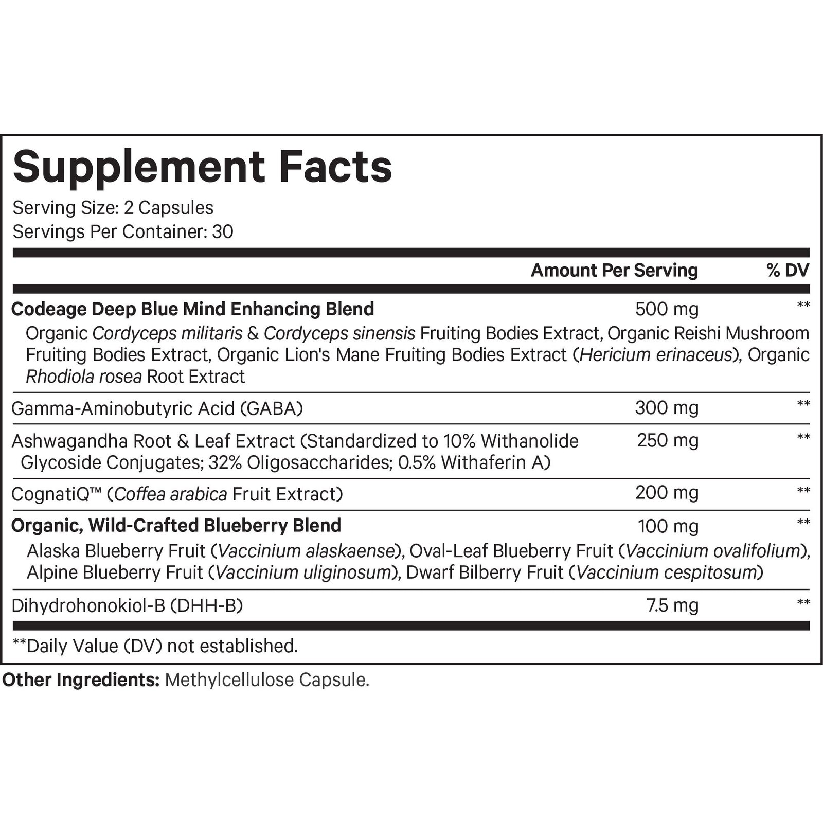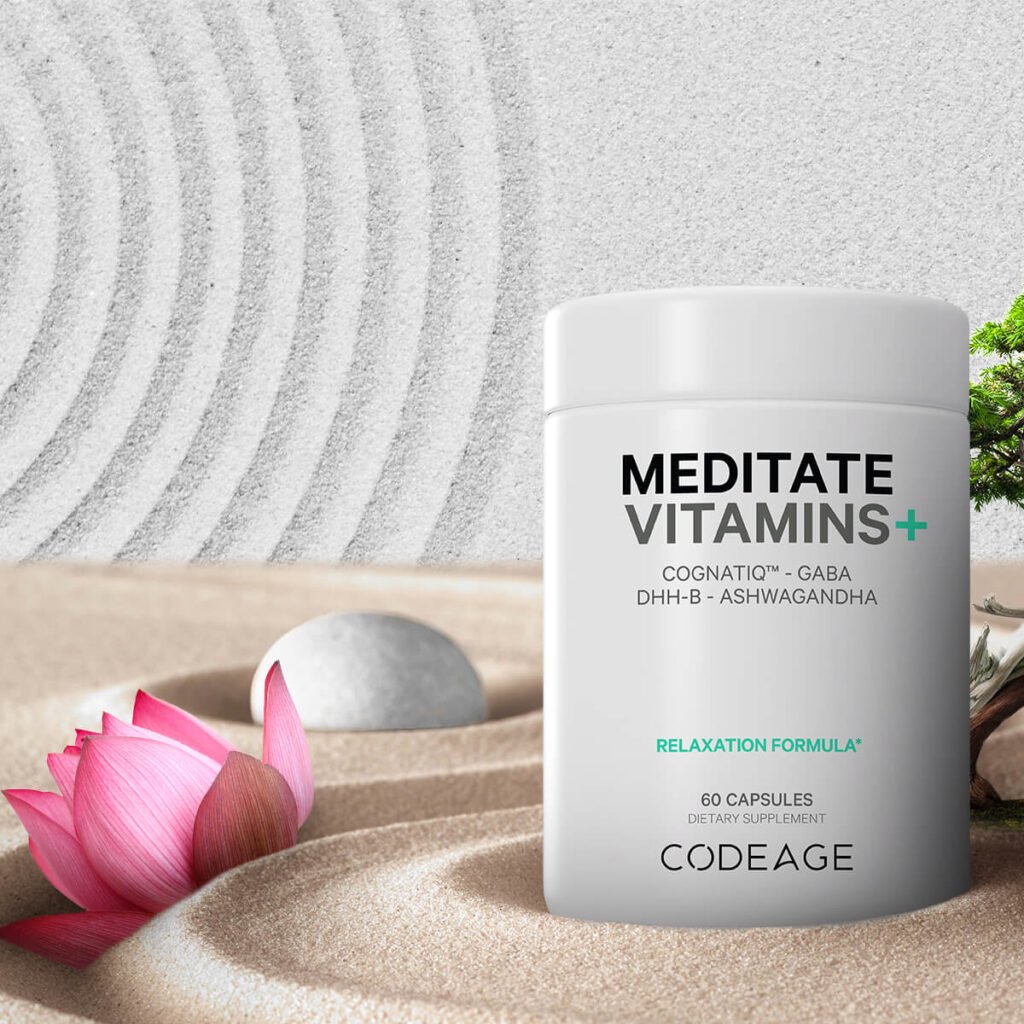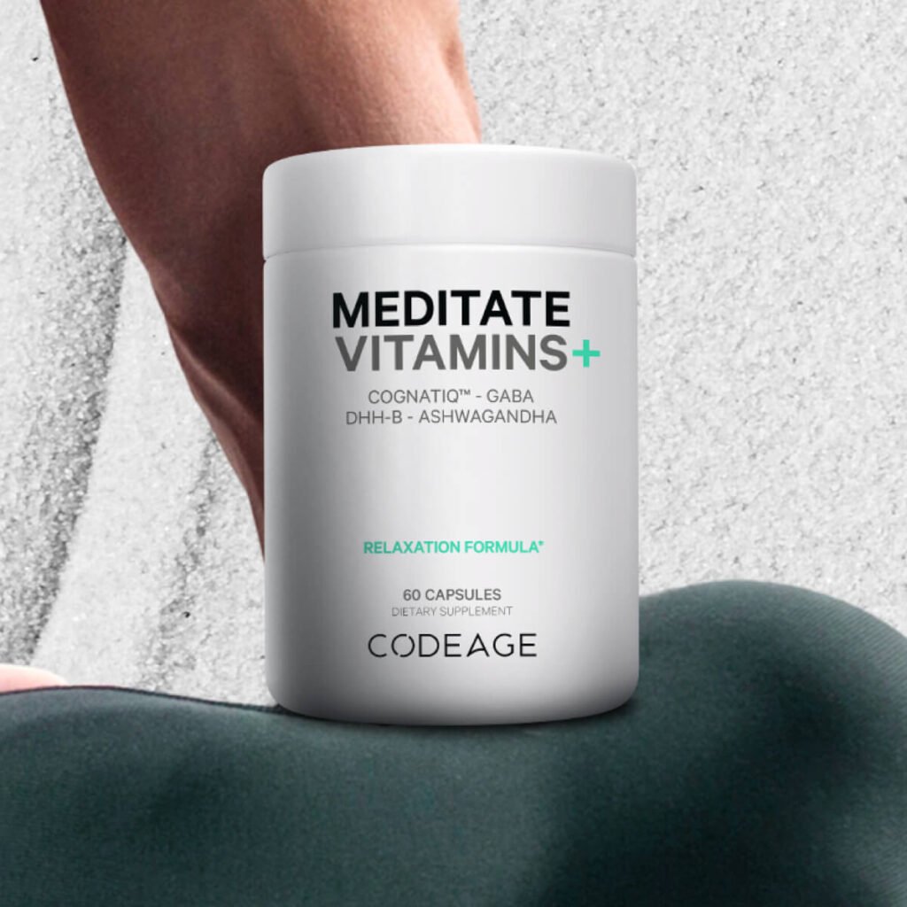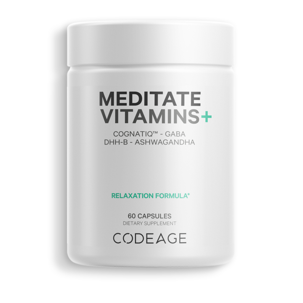 Codeage Meditate Vitamins+ combines advanced ingredients, including CognatiQ™, a patented ingredient linked to brain health, DHH-B, GABA, ashwagandha, organic mushrooms, and blueberries in a convenient capsule format.