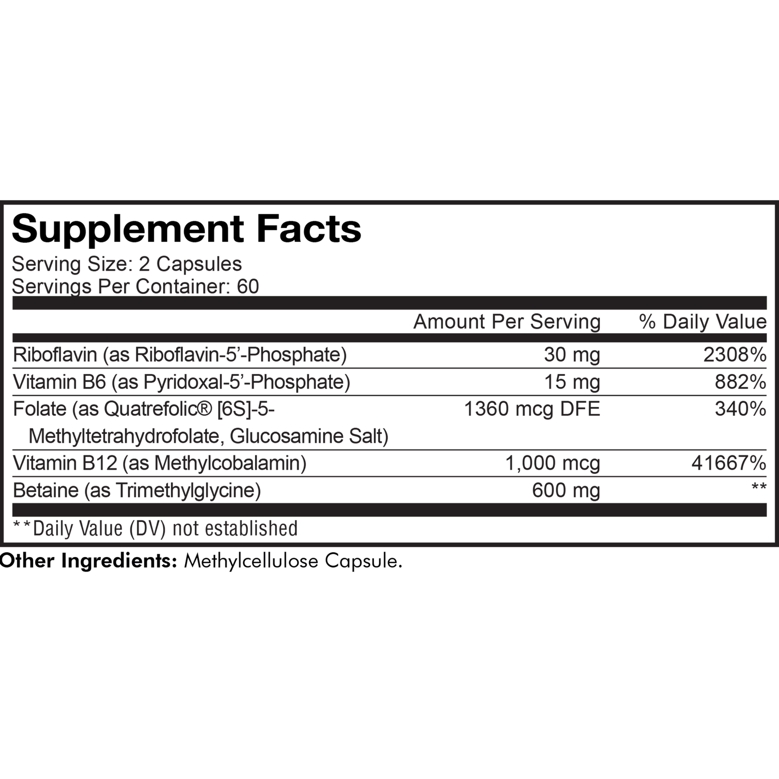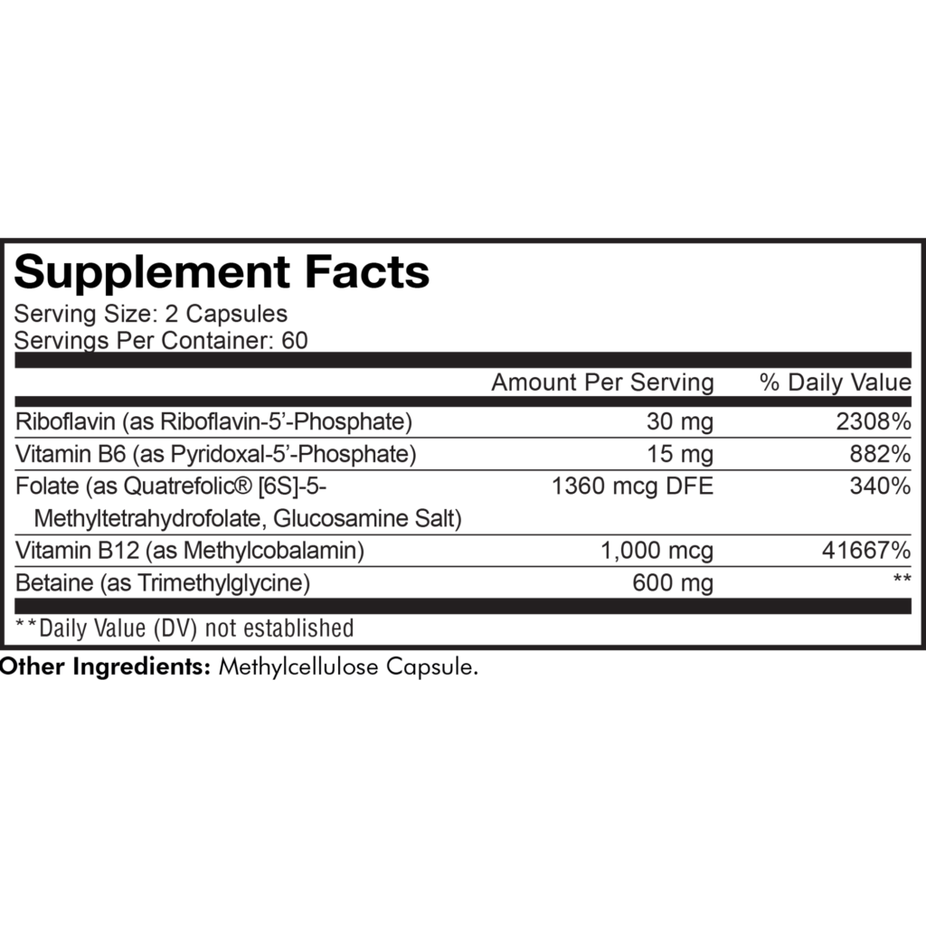 - These methylated vitamins harmoniously combine 600 mg of betaine (trimethylglycine TMG) with Vitamins B6 and B12 in their superior phosphorylated forms.