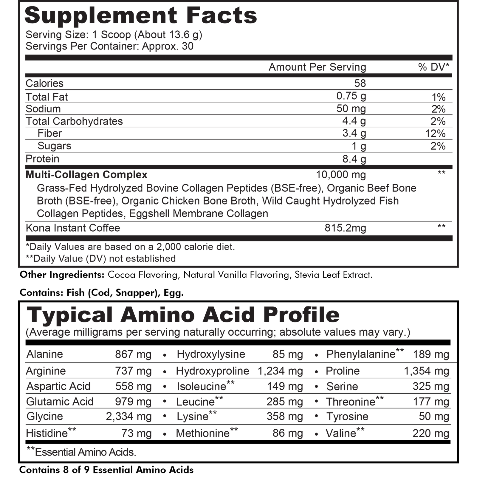 - Infused with gourmet Kona coffee, known for its low-acid profile and premium quality, Codeage Multi Collagen Peptides Mocha provides a smooth and flavorful coffee experience. Mix one scoop into hot water or blend with ice for a refreshing iced coffee, delivering taste in every sip.