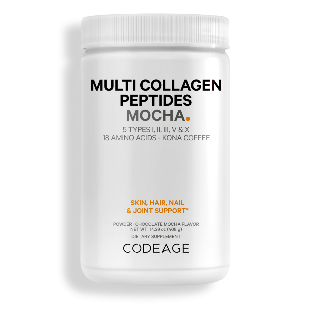 Codeage Multi Collagen Peptides Mocha features a gourmet Kona coffee blend with five types of collagen—types I, II, III, V, and X—from five distinct sources. This delicious mocha collagen coffee creamer also includes 18 amino acids.