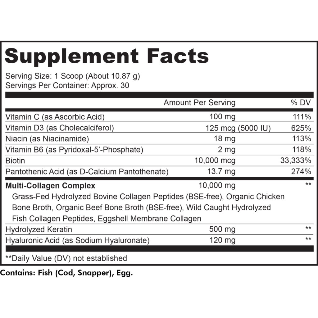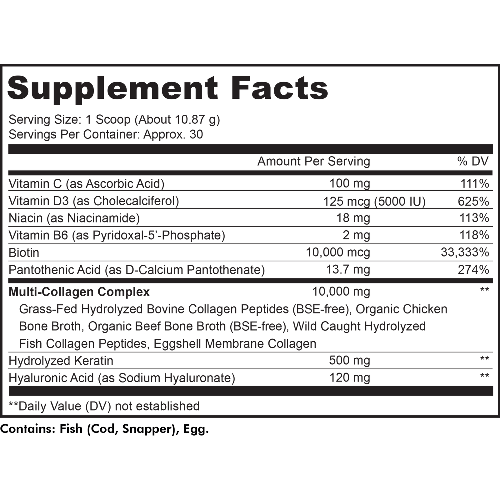 - Codeage Multi Collagen Platinum features 10,000 mcg of biotin, hydrolyzed keratin, and a blend of vitamins B6, C, and D3, alongside hyaluronic acid, niacin, and pantothenic acid.