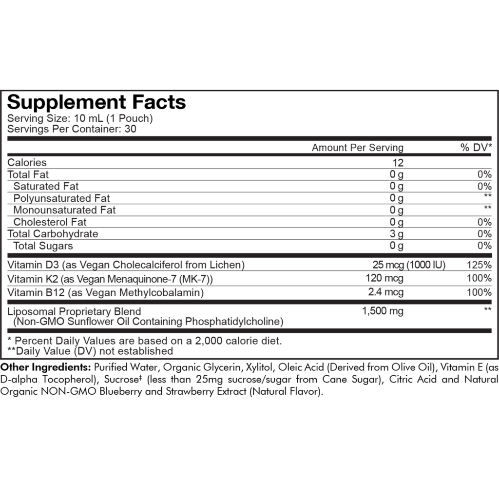 Codeage Nanofood Liposomal Vitamin D3 + K2 + B12 Liquid Pouch offers a convenient 3-in-1 plant-based multivitamin in liquid sachets. Each sachet contains 1000 IU of vegan vitamin D3 from lichen, vitamin K2 (MK-7), and vitamin B12 (methylcobalamin). Each box provides 30 single-serve mixed berry-flavored sachets.