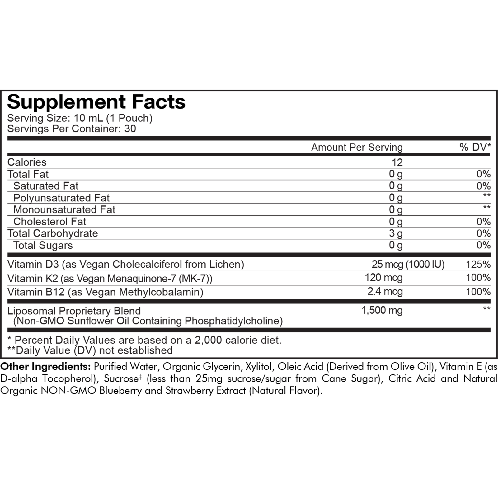 Codeage Nanofood Liposomal Vitamin D3 + K2 + B12 Liquid Pouch offers a convenient 3-in-1 plant-based multivitamin in liquid sachets. Each sachet contains 1000 IU of vegan vitamin D3 from lichen, vitamin K2 (MK-7), and vitamin B12 (methylcobalamin). Each box provides 30 single-serve mixed berry-flavored sachets.
