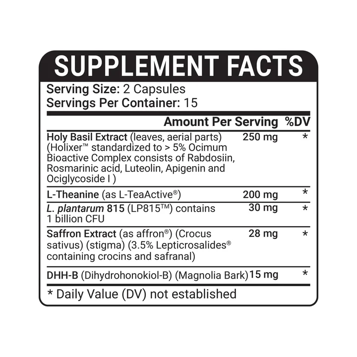 Serenity features a specialized form of Holy Basil called Holixer™ which is a patented and extensively researched preparation standardized to contain at least 5% Ocimum Bioactive Complex, a unique blend of bioactive compounds including Rabdosin, Rosmarinic acid, Luteolin-7-o-beta-glucuronide, Ociglycoside I, and Apigenin-7-o-beta-glucuronide.