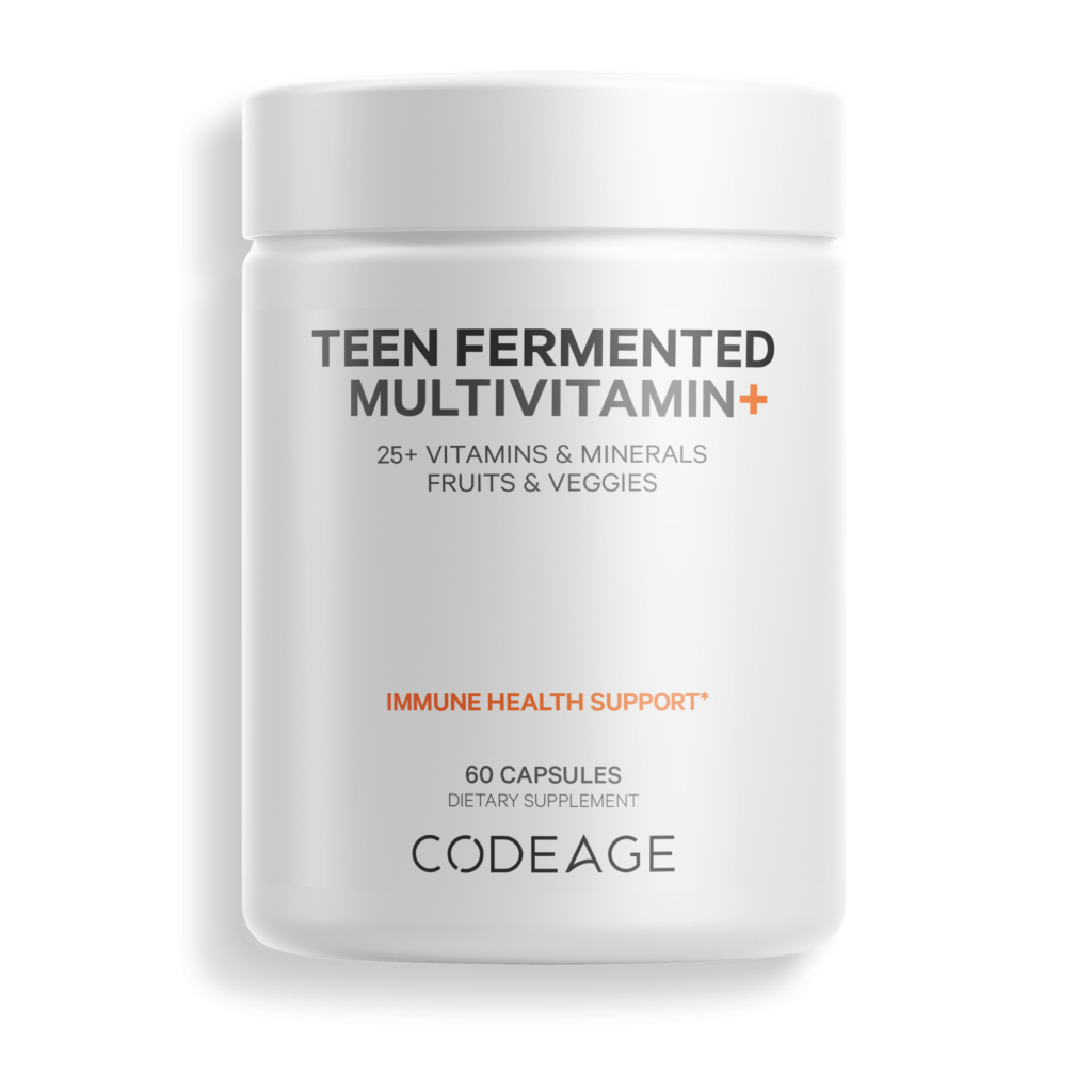 Codeage Teen Multivitamin+ is a comprehensive blend of over 25 vitamins and minerals designed specifically for teenagers boys and girls aged 12 to 18. This formula includes essential vitamins such as A, B, C, D, E, and K, along with biotin, folate, calcium, omega-3, CoQ10, zinc, magnesium, selenium, and phosphorus, plus enzymes, probiotics, and organic whole foods.
