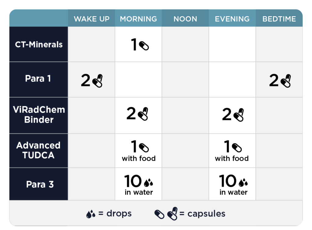 Para 3 is introduced in this step to support the body’s natural detoxification processes in the cells and tissues.* ViRadChem Binder further assists systemic detoxification, while CT-Minerals supports mental clarity, energy production, and cellular repair and immunity.*