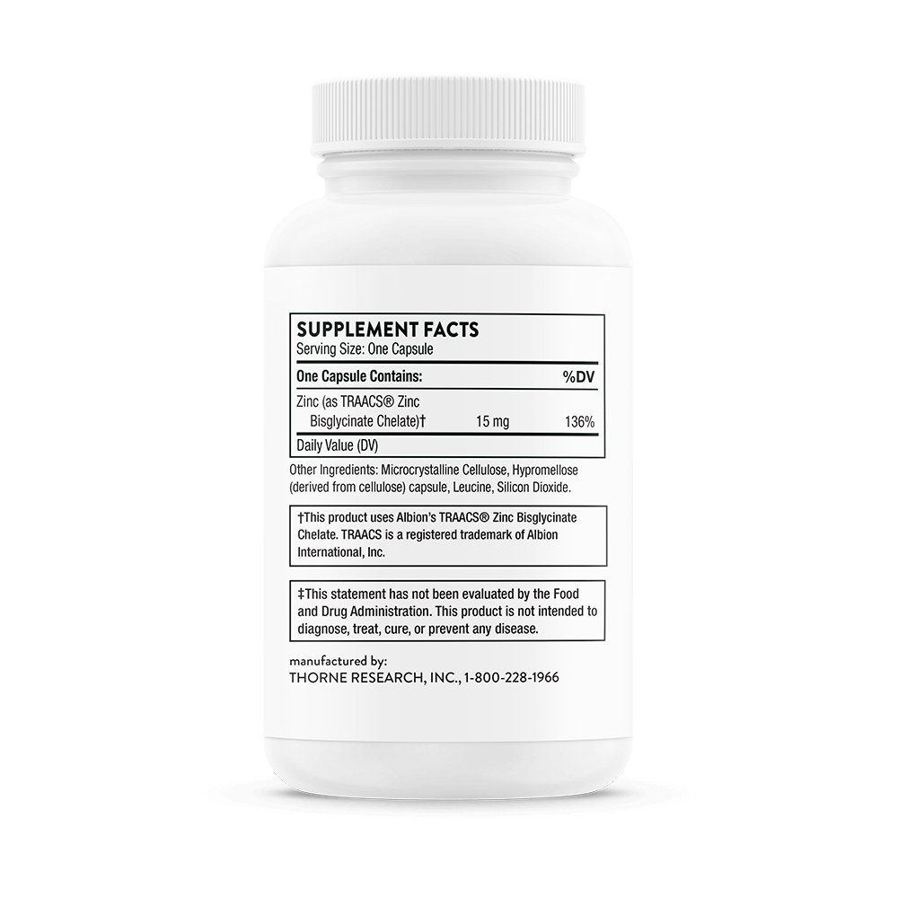 If the body has trouble absorbing a nutrient, then it can't obtain the nutrient’s benefits. Thorne offers two highly absorbable forms of zinc: Zinc Picolinate and Zinc Bisglycinate. Zinc Picolinate is zinc that is bound to the organic acid picolinic acid, which is naturally made in the body from the amino acid L-Tryptophan. Zinc Bisglycinate is zinc that is bound to two molecules of the amino acid glycine – creating a true amino acid chelate.